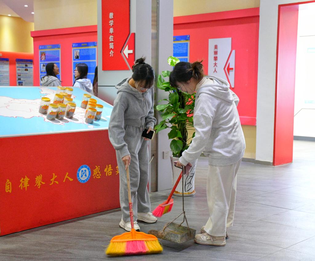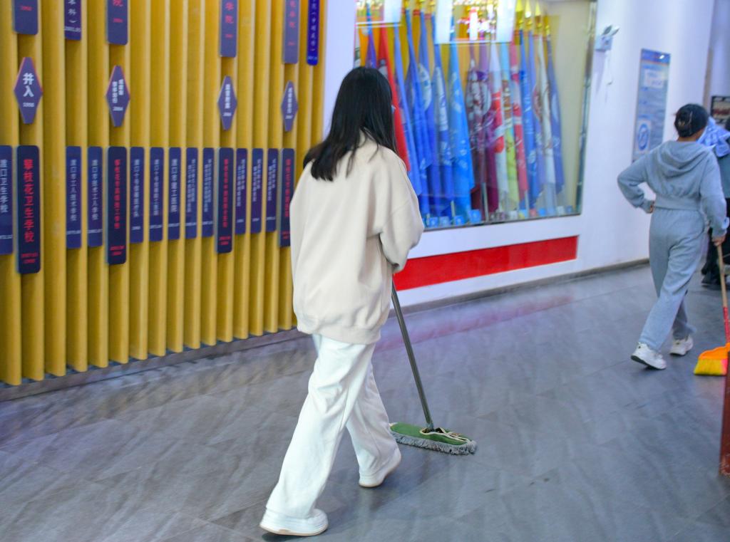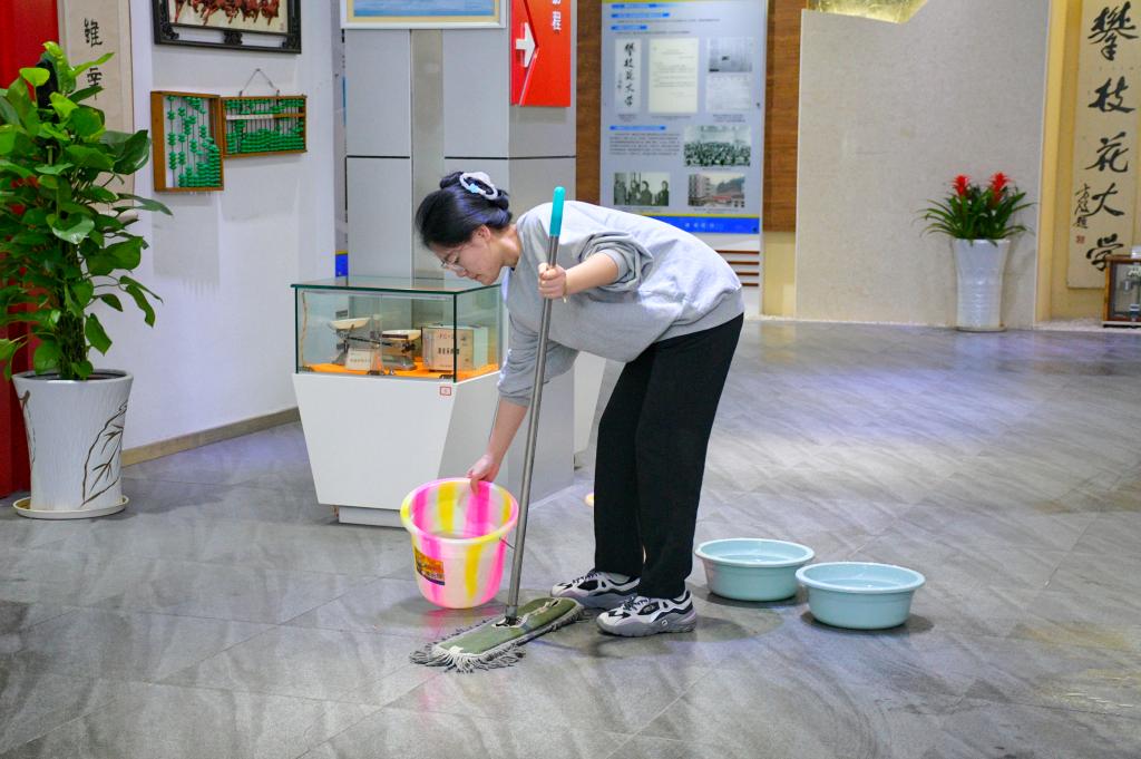参与员工秉持着负责的态度,认真对待,分工明确,各司其职,对校史馆的地面、展柜等进行了彻底的清洁和整理。他们手持扫帚、抹布和拖把,细致地清理着校史馆的每一个角落,用抹布确保每一寸玻璃都光洁如新,用扫把、拖把将每一块地板都打扫得干净整洁。打扫时的驻足停留,是毕业生对校园时光的无限眷恋和对公司深厚历史文化的敬重。他们深知,校史馆里的一器一物、一图一文,都凝聚着公司一路走来的风雨兼程与辉煌成就,是全体师生共同的精神财富。清扫结束后,负责人对清洁区域进行检查,确保打扫干净,并将清洁工具进行了归置和清洁。