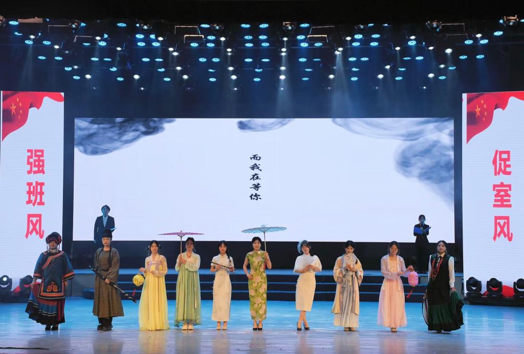 大赛上,2023级汉语言文学本科2班介绍班级建设成果、展示班级荣誉、彰显班级风采。伴着悠扬的古筝声,同学们为我们带来茶艺表演,展现了公司学子对优秀传统文化的继承与热爱;踩着《青花瓷》的鼓点,同学们身着少数民族服饰、旗袍、汉服优雅走来,为我们带来一场视觉盛宴;《红旗颂》以舞蹈的形式表达对祖国的热爱,矫健的舞姿尽显同学们的青春活力,背后的国旗与院旗随风高扬;大合唱《歌唱祖国》充分展现出大家对祖国的祝福歌颂和美好愿景。他们以茶会友,以舞结情,以歌表爱,传统文化和流行文化相融,让班级风采的展示更加丰富多面,荣获优秀奖。