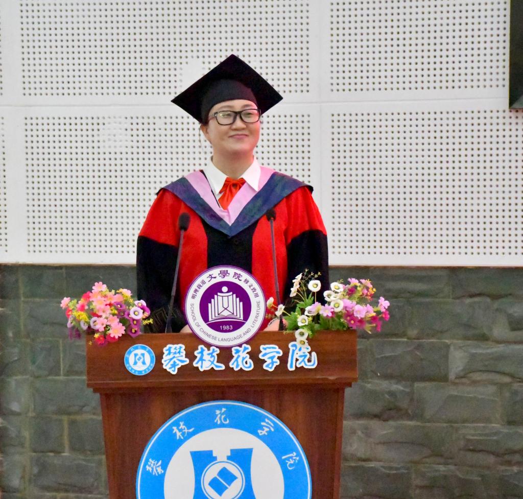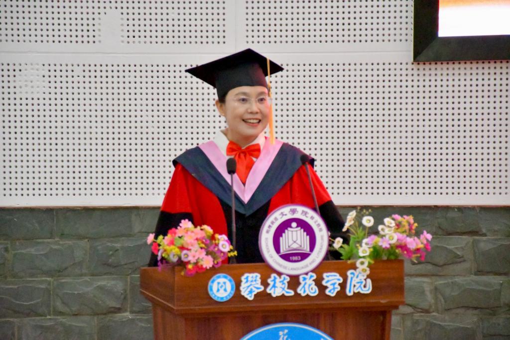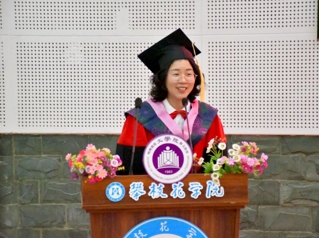 教师代表刘佳以饱含深情的话语,回顾了与员工相处的教学时光,也分享了为人师长的个人感悟。鼓励大家走出校园后,依旧保持对知识的渴望、对生活的热爱,无论身处何方,都要坚守初心,用文院学子的温度与深度去拥抱世界。