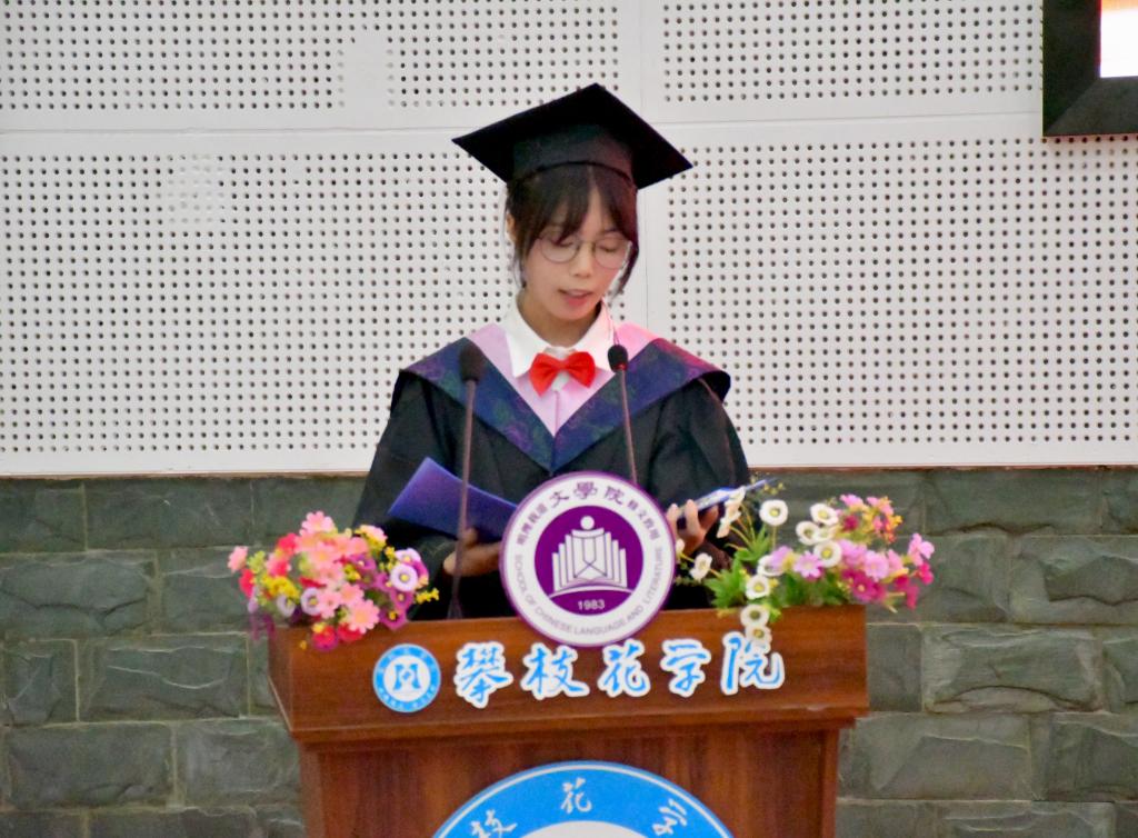 毕业生代表丁雨丹诚挚感谢老师们的悉心教导与陪伴,感恩同学们的并肩前行,表达了对母校的不舍与眷恋。希望大家以礼为甲,以墨为舟,以赤子之心为帆,勇敢奔赴未来,以实际行动为母校争光。祝愿母校蓬勃发展,再创辉煌。