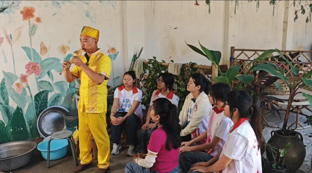 据村干部及傣族长老介绍,红岩村主要居住着傣族、彝族和汉族,其中以傣族和汉族为主。在长期的共同生活中,各民族居住格局呈现“你中有我,我中有你”的交错状态,大多数习俗已逐渐汉化,日常交流也以汉语为主。这种深度融合的生活图景,正是各民族长期交往交流交融的生动写照。采访过程中,傣族长老穿上特色的民族服饰。热情的为实践团成员演奏传统文艺葫芦丝曲,还教授实践团成员跳橡皮鼓舞,实践团成员了解到橡皮鼓舞是泼水节的一个重要组成部分。