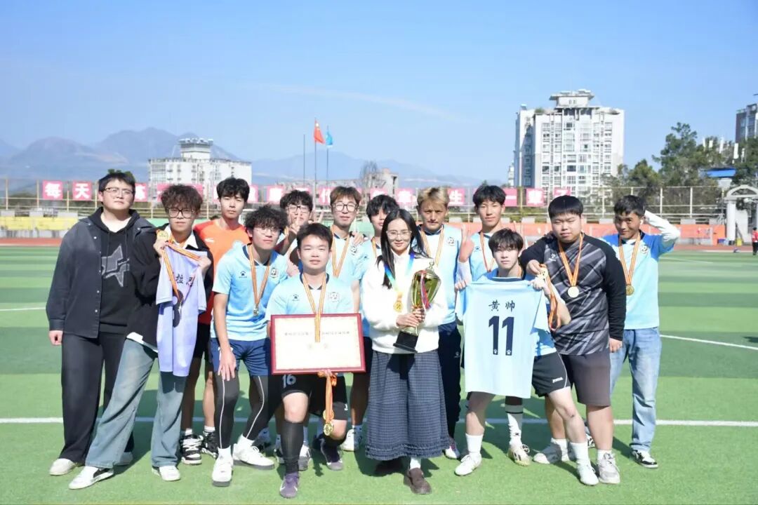 男足队员们攻防兼备、奋勇争先,精准传球与凌厉射门尽显实力;场边助威声此起彼伏,凝聚成团结奋进的力量。这份荣誉,是队员们刻苦训练的回报,是教练悉心指导的成果,彰显了文、法学子的昂扬风采,为校园文化注入新活力。