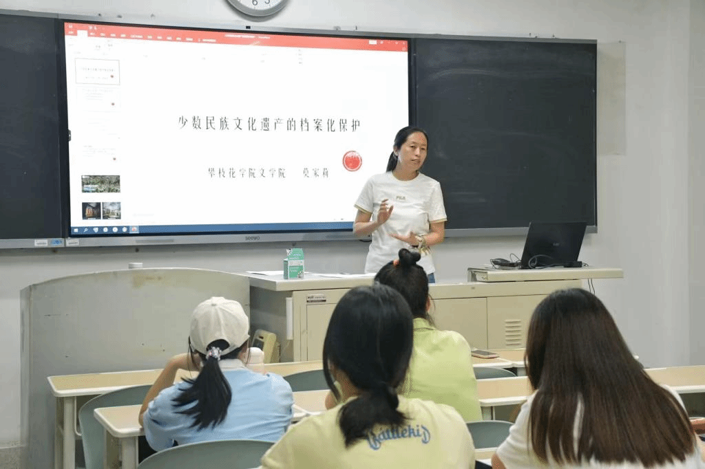 莫家莉围绕民族文化遗产档案化保护背景、保护方法和民族文化遗产及其保护的紧要性三个方面展开讲解。她强调了民族文化遗产档案化的重要性和必要性,为同学们介绍了有关档案化保护的世界遗产项目、世界记忆项目、保护非物质文化遗产公约的国际化背景,阐述了文化遗产的分类和文化遗产档案化的意义,表示文化是“根”,文化遗产承载着历史记忆,一定要加强对各民族文化的挖掘和保护,还为同学们展示典型的文化遗产档案并讲述少数民族文化遗产与文化的关系、文物和档案的区别、档案资料的收集整理、档案保存条件以及创新建档保护方法等。此外,莫家莉还提到我国有许多世界文化和自然遗产,同学们都热烈讨论,积极发言。