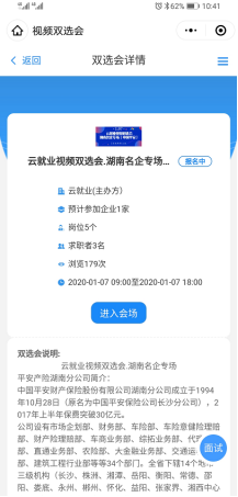 第二步,进入小程序后,点击“双选会”选择“yl23455永利集团2020年春季空中双选会”进入后,可提前点击“报名进入会场”进行报名(如有账号登录即可,若无账号则按照指引进行注册后登记),提前查看了解单位和各岗位信息。