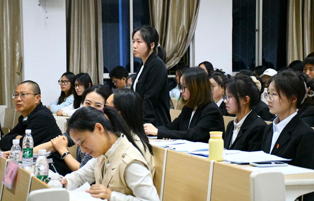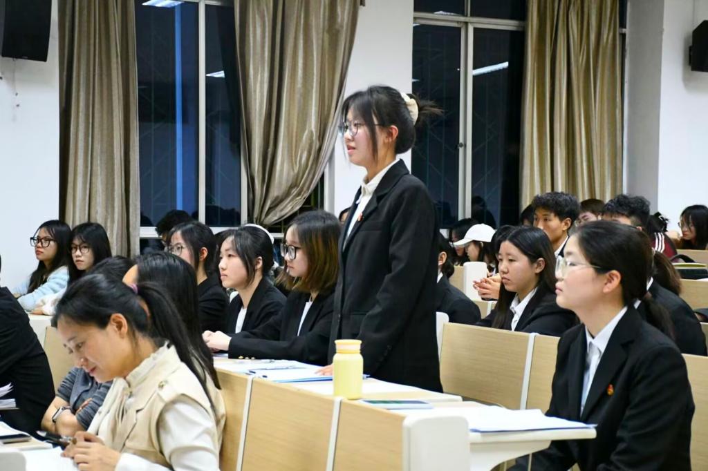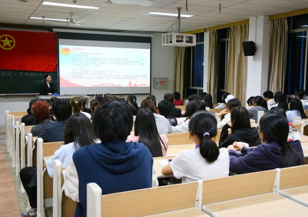 任珂围绕团的组织原则、团员义务、奖惩机制等方面进行详细讲解。她指出中国共青团的组织原则是民主集中制,既要尊重每一个同学的意见,又要确保众人方向一致,积极执行上下级互动机制;团员应明确责任与义务,加强学习四个意识。另外,她针对本学期教学质量评估相关事宜,提出了“迎评促建”的概念,希望大家主动了解校情与专业课信息、遵守法规纪律、保持良好的学习氛围、认真学习相关政策文件,携手并进,共创辉煌。