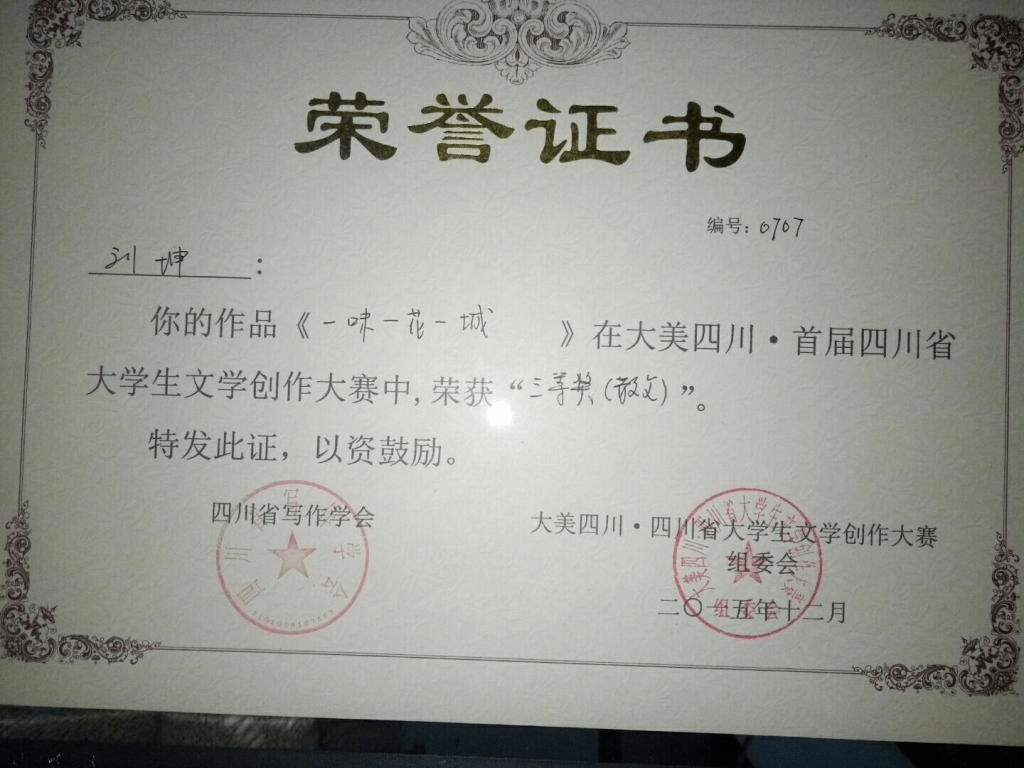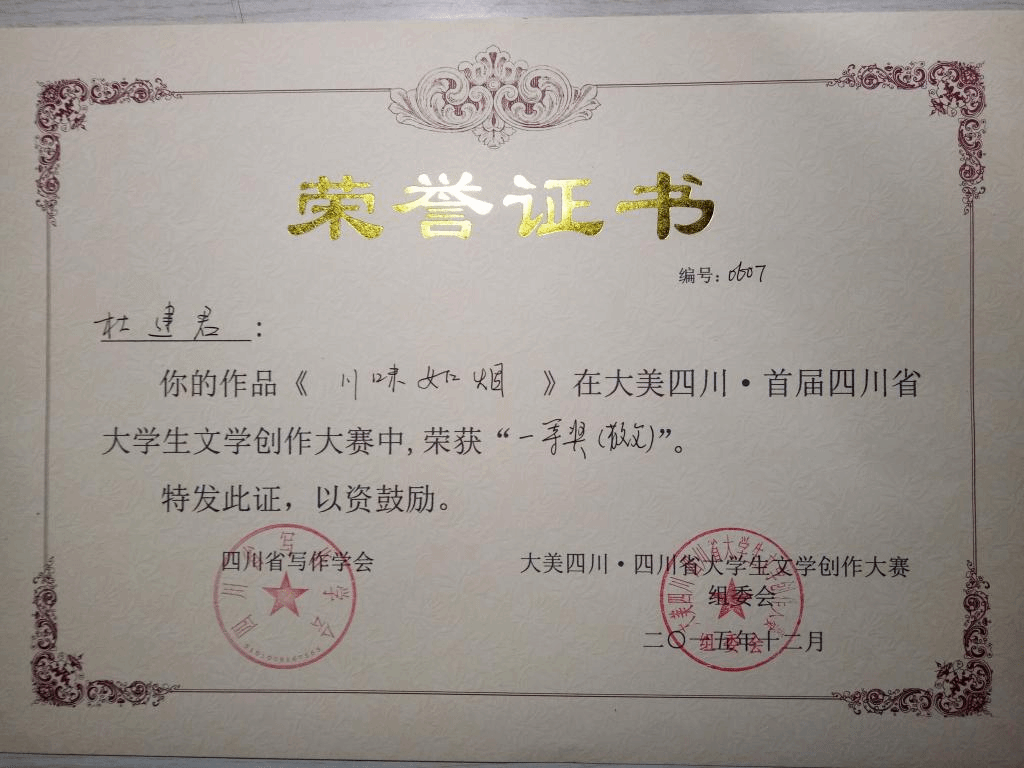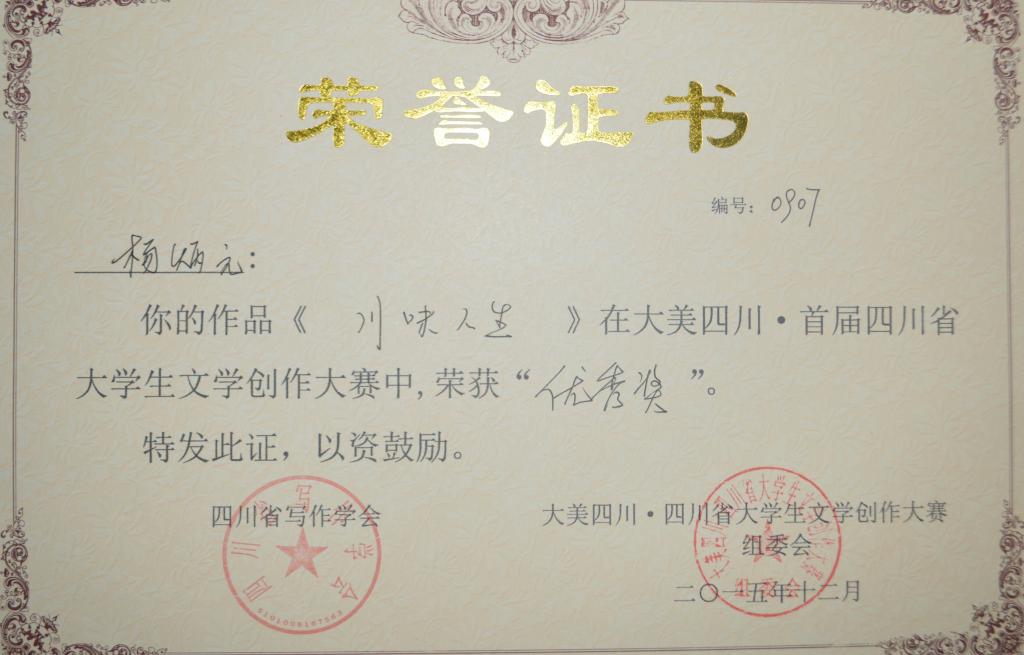 2015年“大美四川•四川省老员工文学创作大赛”获奖荣誉