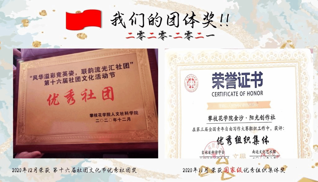 金沙·阳光创作社获得精品社团的荣誉,是对社团打造书香校园、展现文学魅力的肯定与鼓励。未来的金沙·阳光创作社也将不忘初心、砥砺前行,致力于举办更多的优质活动,让更多人领略文学的魅力,让“明德砺志,博学笃行”的校训深深扎根于每一位攀大学子的心中。
