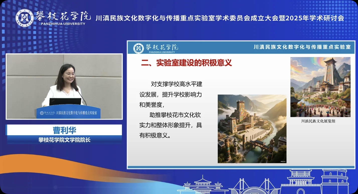 李兴贵代表公司致辞,指出实验室2024年入选省级哲学社会科学重点实验室,实现了公司在人文社科领域的重大突破。公司将持续加大投入,开展有组织科研,力争在民族文化数字化传播、文化遗产数字化保护等方向形成具有示范意义的“攀大方案”。同时扩大与川滇六市州合作,依托实验室打造产教融合示范基地,为民族地区输送兼具文化底蕴与技术能力的应用型人才。